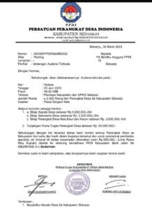 Sidoarjo~www.pilarcakrawala.news|Adanya kegiatan undangan audensi terbuka di ikuti kurang lebih dua ribu perangkat desa tergabung dalam persatuan perangkat desa indonesia (PPDI) Kabupaten Sidoarjo pada hari Selasa 20 Juni 2023 untuk menyuarakan haknya menuju gedung DPRD kabupaten Sidoarjo dan pendopo Kabupaten Sidoarjo.