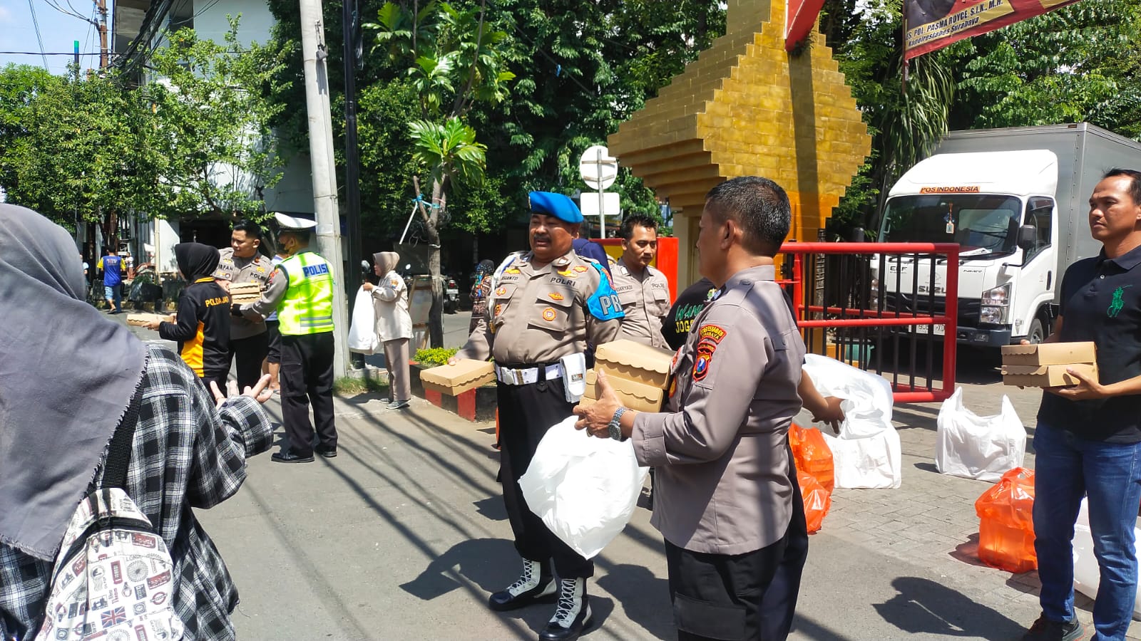 Langsung saja Kompol Mohammad irfan membagikannya 200 nasi kotak yang berisi telur ayam daging sapi sayuran dan nasi kemudian ke warga sekitar Polsek Simokerto juga ke pengendara yang melintas seperti ojek online, tukang becak, sopir bemo serta jukir.