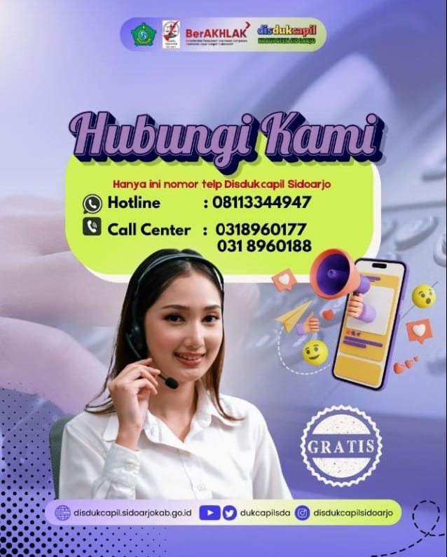 Semua pelayanan yang diberikan oleh Disdukcapil Kabupaten Sidoarjo bersifat gratis. Jika ada pihak yang menghubungi dan mengaku sebagai petugas Disdukcapil Kabupaten Sidoarjo agar segera melaporkan kepada Disdukcapil Kabupaten Sidoarjo atau pihak Desa/Kelurahan, pihak Kecamatan maupun Kepolisian setempat untuk ditindaklanjuti. (Nic)