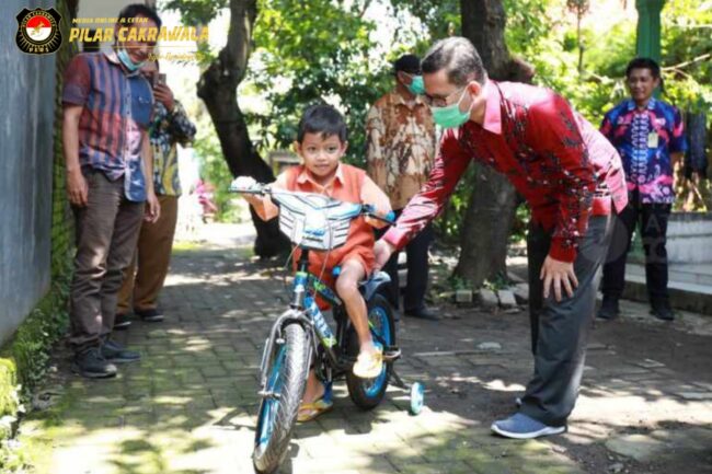 Seperti layaknya bocah umur 5 tahun, Rizal yang saat ini duduk di sekolah TK A di kampungnya, Desa Kedensari, Kecamatan Tanggulangin itu langsung menaiki sepeda barunya.
