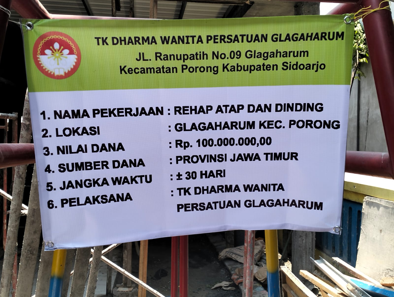 Sidoarjo~www.pilarcakrawala.news|Beberapa bantuan anggaran Provinsi Jawa timur realisasi seperti halnya TK Dharma wanita desa Glagaharum kecamatan Porong mendapatkan seratus juta rupiah sesuai yang tertera di banner proyek di halaman TK Kamis,26/10/2023