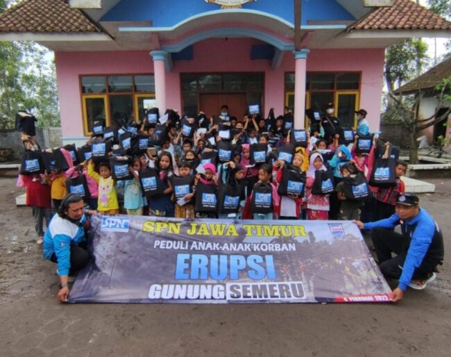 Pilar Cakrawala ~ Lumajang, minggu (6-2-2022) bertempat di Sekolah Dasar Negeri (SDN) Supit urang 02, Serikat Pekerja Nasional (SPN) Jawa Timur menyalurkan bantuan dari anggota SPN se Jawa Timur bagi anak-anak korban bencana erupsi gunung semeru di dusun sumbersari desa Supiturang, kec. Pronojiwo, kab.Lumajang Jawa timur.
