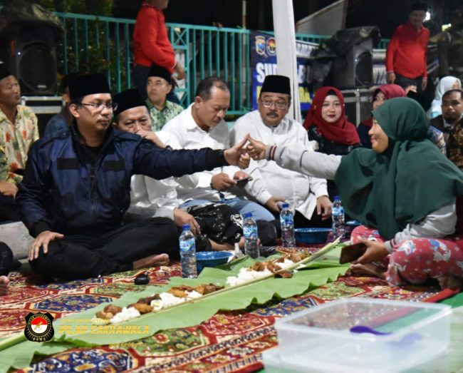 Ribuan warga melakukan doa bersama ini digelar lesehan. Tidak ada tempat khusus bagi tamu, undangan atau penjabat VIP. Semua duduk lesehan dan makan di atas daun pisang dengan hidangan seadanya.