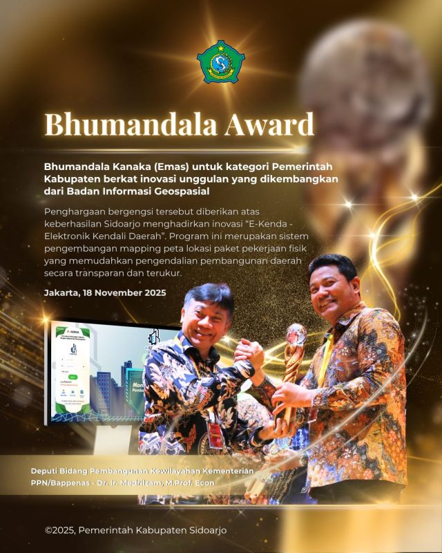 “Penghargaan Bhumandala Kanaka ini bukan hanya milik pemerintah, tetapi milik seluruh masyarakat Sidoarjo. E-Kenda hadir karena kebutuhan nyata untuk memperbaiki tata kelola pembangunan agar anggaran dapat dipertanggungjawabkan dan manfaatnya dirasakan cepat oleh warga,” ujar Subandi.