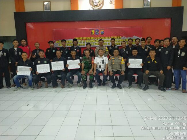 Kapolsek Tambaksari bersama dengan 3 Pilar Tambaksari mengundang seluruh Perguruan Pencak Silat se-Kecamatan Tambaksari untuk melaksanakan penandatanganan Kesepakatan Bersama guna menciptakan situasi kamtibmas yang aman dan kondusif di wilayah Kecamatan Tambaksari bertempat di pendopo kecamatan tambak sari,Rabu (24/5/2023).