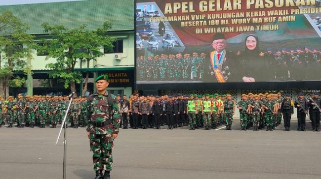 Surabaya~www.pilarcakrawala.news|Bertempat di Lapangan A. Yani Makodam V/Brawijaya Dandim 0830/Surabaya Utara Kolonel Inf Budi Handoko, S. S.Sos., Selaku Dansubsatgas Obyek Hotel Vasa mendampingi Danrem 084/Bhaskara Jaya Brigjen TNI Terry Tresna Purnama, S.I.Kom., M.M. selaku Komandan Satuan Tugas Pengamanan Wilayah (Dan Satgas Pamwil) memimpin langsung pelaksanaan Apel Gelar Pasukan dalam rangka kesiapan Pengamanan VVIP Kunjungan Kerja Wakil Presiden RI Beserta Ibu Hj. Wury Ma’ruf Amin di wilayah Jawa Timur, Senin (13/3/2023)