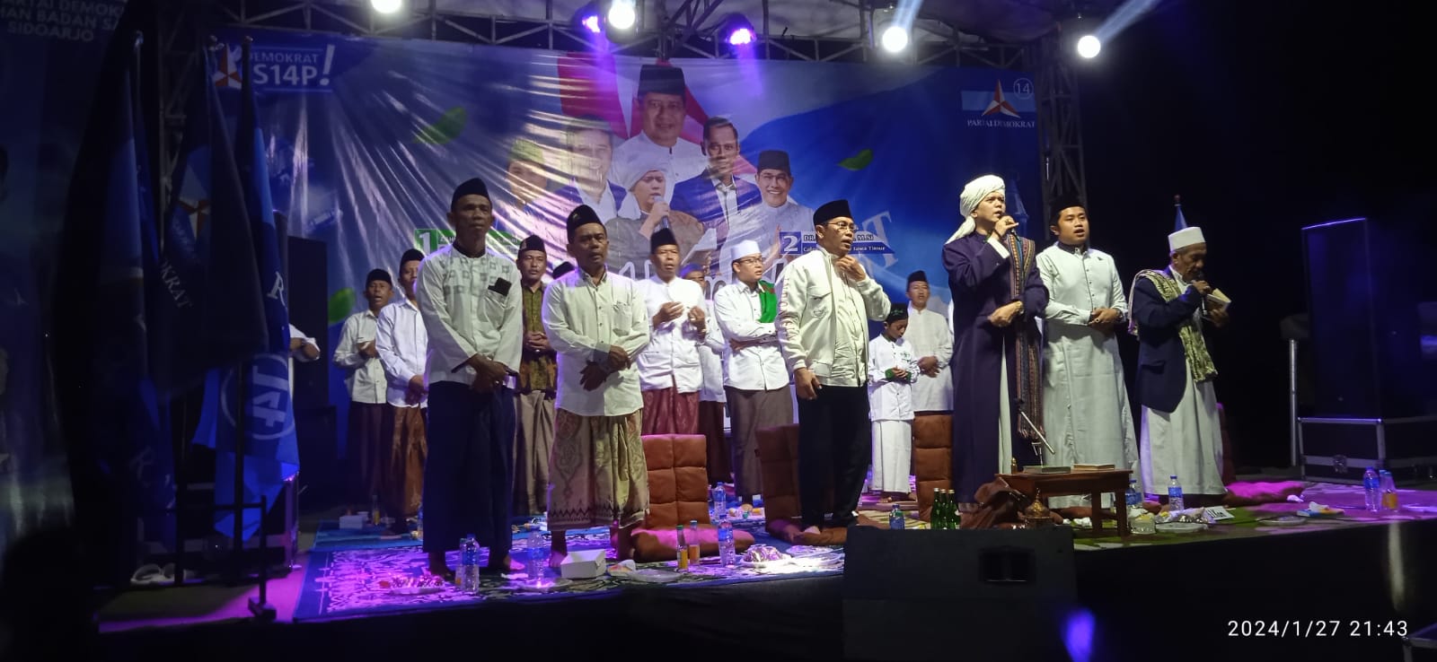 Sidoarjo~www.pilarcakrawala.news|Menuju pemilu 14 Februari 2024 DPC Partai Demokrat Sidoarjo menggelar acara Demokrat bersholawat. Acara dilaksanakan di lapangan Yussar Fishing. Sabtu (27/1/2024) malam.
