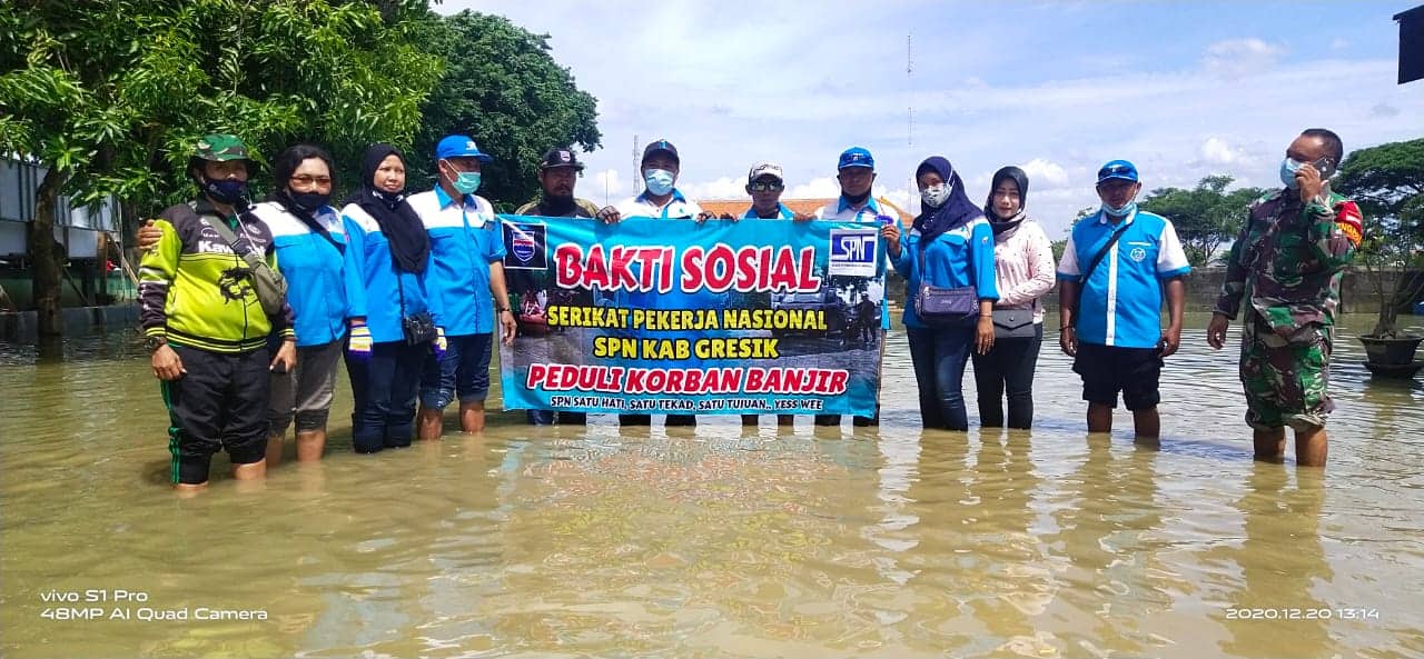 Minggu, 20 Desember 2020 DPC SPN Kab. Gresik mendistribusikan bantuan penggalangan bakti sosial yang dikumpulkan oleh PSP SPN se-Kab. Gresik untuk korban bencana banjir di Kab. Gresik, Jawa Timur. Penyerahan bantuan diberangkatkan pada pukul 10.00 WIB didepan PT. Weltes sebagai titik kumpul, serta didampingi perwakilan DPD SPN Jatim, pengurus PSP SPN dan dikawal Laskar Nasional SPN.