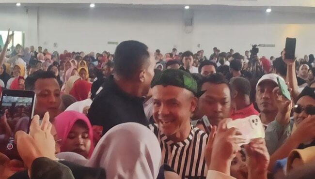 Kedatangan Ganjar Pranowo di sambut oleh masyarakat Jawa timur serta Ketua GP Link Indonesia Hengky Kurniadi, Ketua Gemar GP Qurrota Ayyun dan Sekretaris Gemar GP Jatim Luluk Juliati .