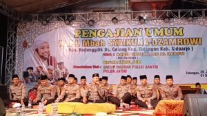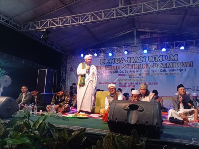 Acara haul akbar berlangsung dengan hikmad dan meriah ini berjalan dengan sukses sampai malam para jamaah milenial enggan berhenti bersholawat bersama para polisi santri Polda Jatim ini.(As).