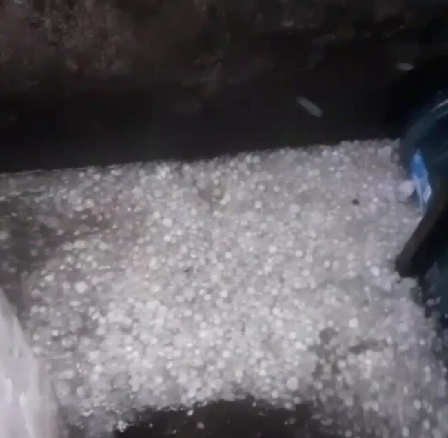 setelah mendung gelap disusul hujan deras, namun yng dirasakan ada benda keras membentur atap rumahnya. Setelah dilihat ternyata bongkahan es berwarna putih berdiameter sekitar 0,5 hingga 1 cm berserakan di tanah.