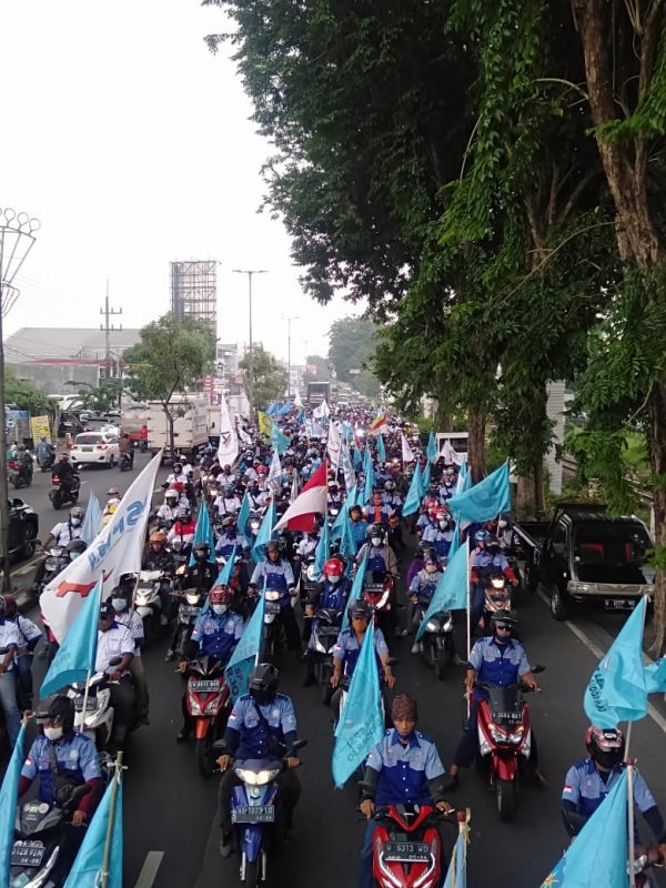 Para buruh berhenti hampir separuh jalan. Mereka memarkir motor dan membawa sejumlah pengeras suara di mobil komando. Sejumlah petugas kepolisian juga terlihat berjaga dan mengatur arus lalu lintas.