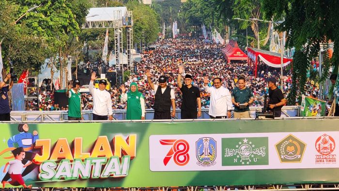 Jalan sehat yang diikuti Ribuan peserta dengan mengambil start dan finish di Gedung Negara Grahadi, Surabaya.Gubernur Jawa Timur Khofifah Indar Parawansa bersama warganya meramaikan kegiatan puncak perayaan Hari Santri 2023.Jalan santai menempuh jarak 5 km, dari Jalan Gubernur Suryo, air mancur ke kanan, bambu runcing lurus, karapan sapi berputar, Jalan Basra lurus, sampai Siola lurus dan kembali lagi ke Gedung Negara Grahadi.