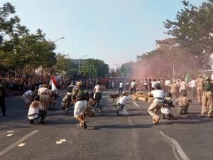 Suara dentuman meriam terdengar nyaring di Jalan Pahlawan, Kota Surabaya. Dentuman itu menandakan atraksi pertempuran 10 November 1945 dimulai, dalam Parade Surabaya Juang 2023 ,Minggu (5/11/2023)sore.