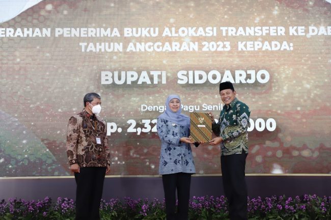 Kamis kemarin, (15/12), penghargaan tersebut diterima Bupati Sidoarjo H. Ahmad Muhdlor S.IP yang diwakili oleh Wakil Bupati Sidoarjo H. Subandi S.H dari Gubernur Jawa Timur Dra. Hj. Khofifah Indar Parawansa M.Si pada acara penyerahan DIPA dan Buku Alokasi TKD 2023 kepada 38 kabupaten/kota se-Jawa Timur di Gedung Negara Grahadi, Surabaya. Dalam acara tersebut Pemkab Sidoarjo menerima Daftar Isian Pelaksanaan Anggaran (DIPA) serta daftar alokasi Transfer Ke Daerah (TKD) tahun anggaran 2023 dengan pagu Rp 2.32 Trilyun yang diserahkan langsung oleh Gubernur Jatim.