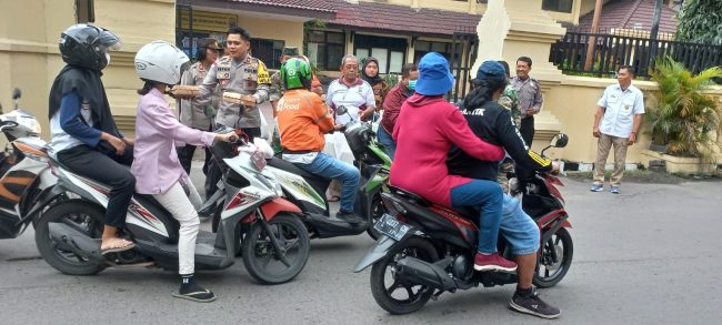 Dengan sukacita para pengguna jalan yang melintas menerima nasi kotak dan lauk yang dibagikan bersama oleh Polsek Dukuh Pakis dan Koramil Karangpilang Surabaya.