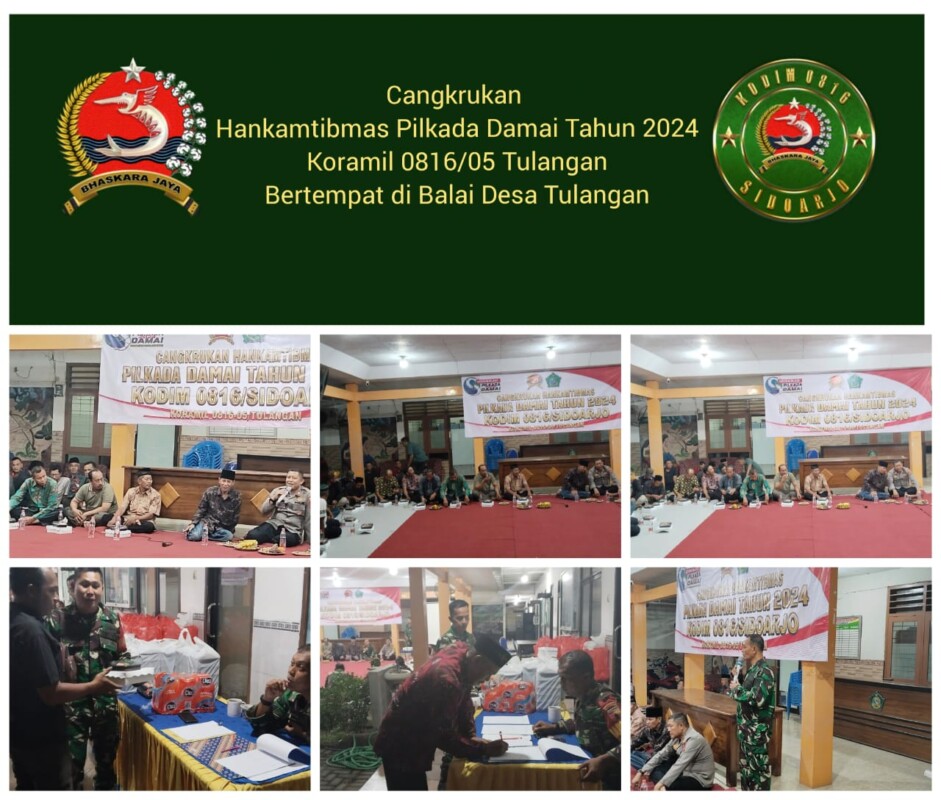 Sidoarjo~www.pilarcakrawala.news|Dalam upaya menciptakan suasana aman dan kondusif menjelang Pemilihan Kepala Daerah (Pilkada) Tahun 2024, Kodim 0816 Sidoarjo menggelar kegiatan Cangkrukan Hankamtibmas Pilkada Damai yang bertempat di Balai Desa Tulangan. Acara yang berlangsung pada Sabtu malam (14/9) ini dimulai pukul 20.00 WIB dan dihadiri oleh berbagai elemen masyarakat Tulangan, menunjukkan sinergi yang kuat antara TNI, Polri, dan masyarakat demi menjaga keamanan wilayah.
