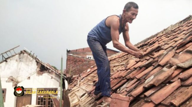 Di lokasi nampak warga menurunkan genting sisa sisa reruntuhan rumah dan kemudian menggantinya dengan terpal.
