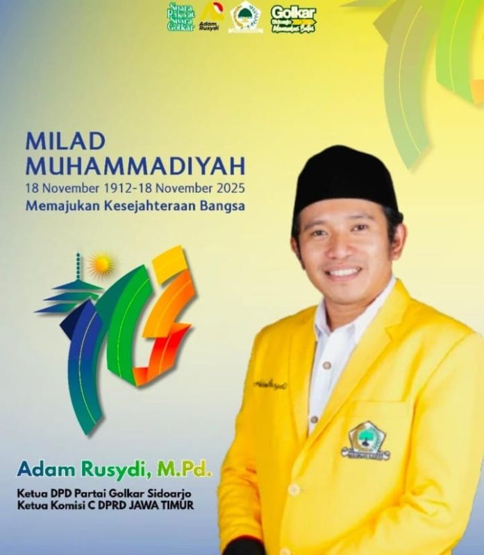 SIDOARJO~www.pilarcakrawala.news| Momentum Milad Muhammadiyah ke-113 tahun menjadi refleksi penting bagi perjalanan salah satu organisasi Islam terbesar di Indonesia. Tidak hanya bagi warga Muhammadiyah, gema milad ini juga mendapat apresiasi luas dari berbagai tokoh nasional dan daerah. Salah satunya datang dari Ketua DPD Partai Golkar Kabupaten Sidoarjo sekaligus Ketua Komisi C DPRD Jawa Timur, Adam Rusydi, M.Pd, yang menyampaikan ucapan selamat serta pesan khusus penuh makna.