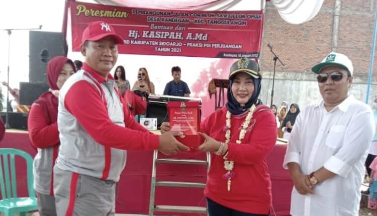Pilar Cakrawala ~ Sidoarjo, Kepedulian Hj. Kasipah A. Md sebagai Fraksi PDI Perjuangan Sidoarjo mengabulkan keinginan warga desa Randegan untuk membangun jalan beton. Ini terbukti dengan diresmikan dan dibukanya pembangunan infrastruktur berupa betonisasi jalan Desa. Beliau langsung hadir di dampingi wakil camat Ir. Ribut Praptoyuwono MM dan disambut kepala desa bersama berangkat dan juga warga di jalan sawah Desa Randegan Kecamatan Tanggulangin Kabupaten Sidoarjo, Minggu, (16/01/22)