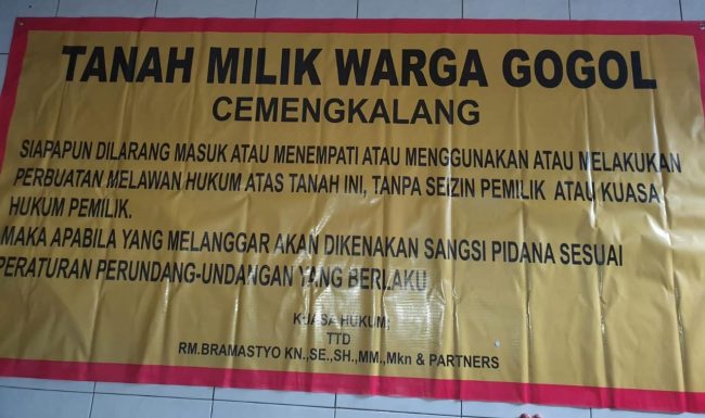 Dalam penegasan RM.Bramastyo KN.SE.,SH.,MM.,MKn & PARTNERS Kuasa hukum masyarakat gogol, ” Sudah lama tujuh puluh lima orang masyarakat ini memberikan toleransi bahkan waktu untuk mengembalikan tanahnya tapi sampai hari ini belum ada kejelasan bahkan kami lihat beberapa waktu adanya oknum yang mematok tanah masyarakat”.