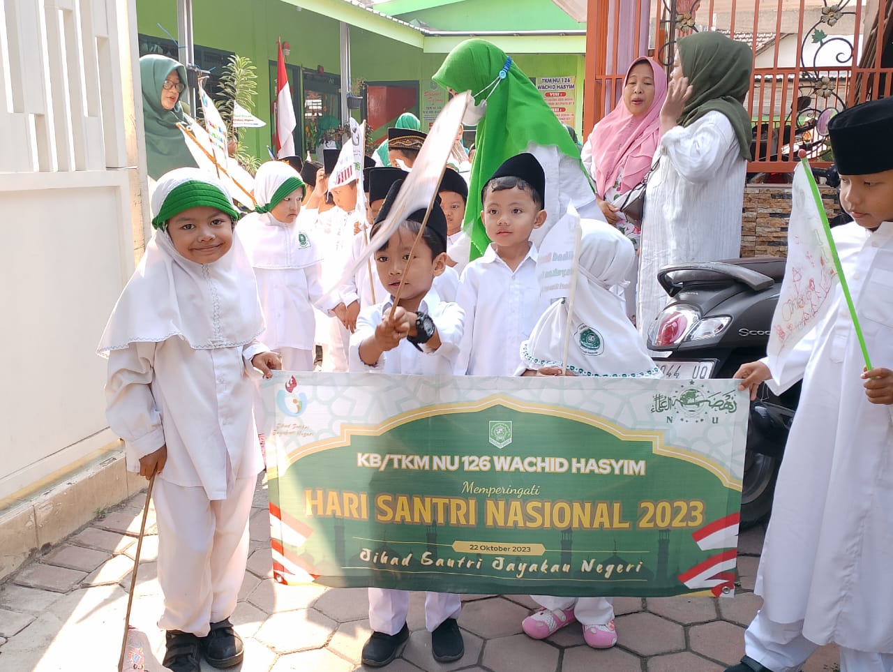 “Maka untuk memperingati hari santri ini kita mengajak anak-anak untuk memeriahkannya dengan jalan santai, dan mengedukasi anak-anak bagaimana ciri khasnya para santri yang memakai kopiah, sarung, jilbab”, Ujarnya.