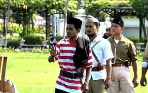 Pilar Cakrawala ~ Surabaya,Minggu 12/12/2021 Komunitas Front Kolosal Soerabaia mementaskan teatrikal berjudul Kompi Maling Matosin di Tugu Pahlawan, Surabaya jawa timur .