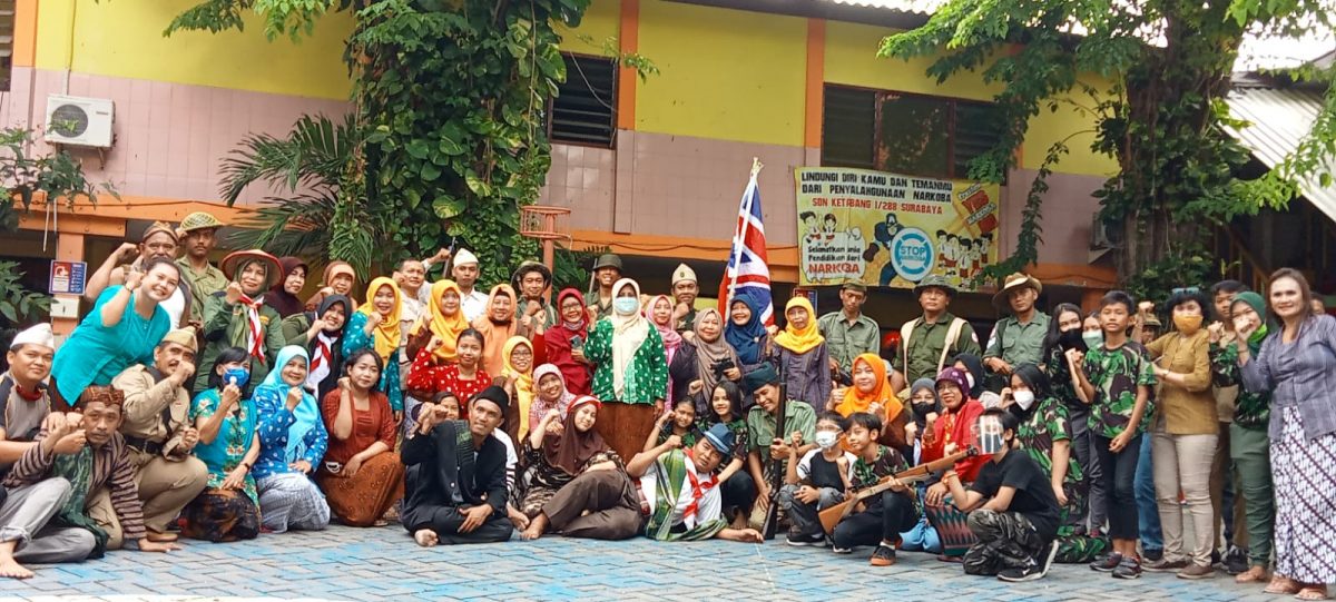 Pilar Cakrawala ~ Surabaya,SDN Ketabang 1 Surabaya, Rabu 10 November 2021 memperingati sekaligus merefleksikan peristiwa 10 November dengan menggelar aksi teatrikal di halaman sekolah. Para guru dan pelajar SD ini melakukan aksi teatrikal di Hari Pahlawan.