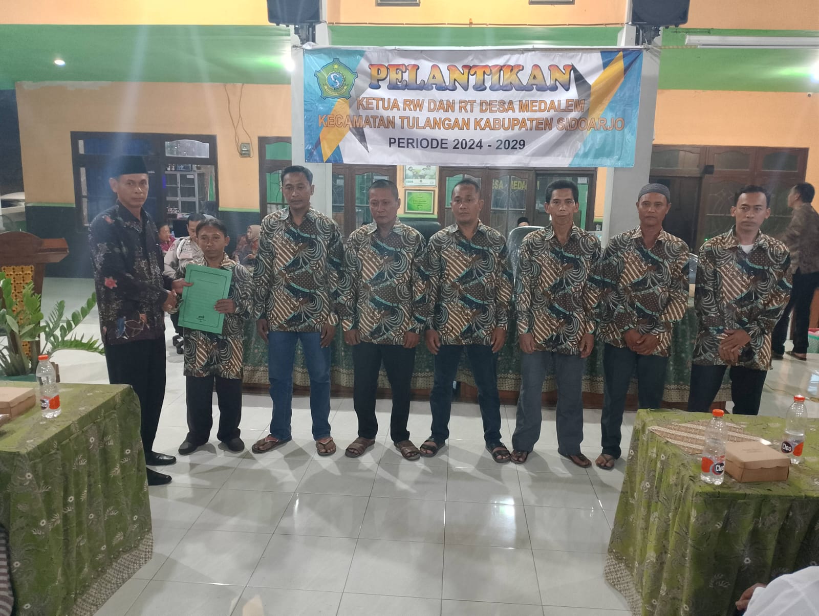 PELANTIKAN KETUA RW DAN KETUA RT DESA MEDALEM KECAMATAN TULANGAN KABUPATEN SIDOARJO DENGAN SLOGAN KEPIMPINAN BARU MASA DEPAN BERSAMA