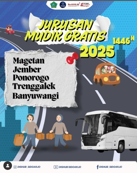 Kuotanya terbatas. Oleh karenanya jangan sampai ketinggalan. Perjalanan pulang kampung yang nyaman dan aman bisa dinikmati lewat program Mudik Gratis yang rutin digelar Pemkab Sidoarjo menyambut Idul Fitri.