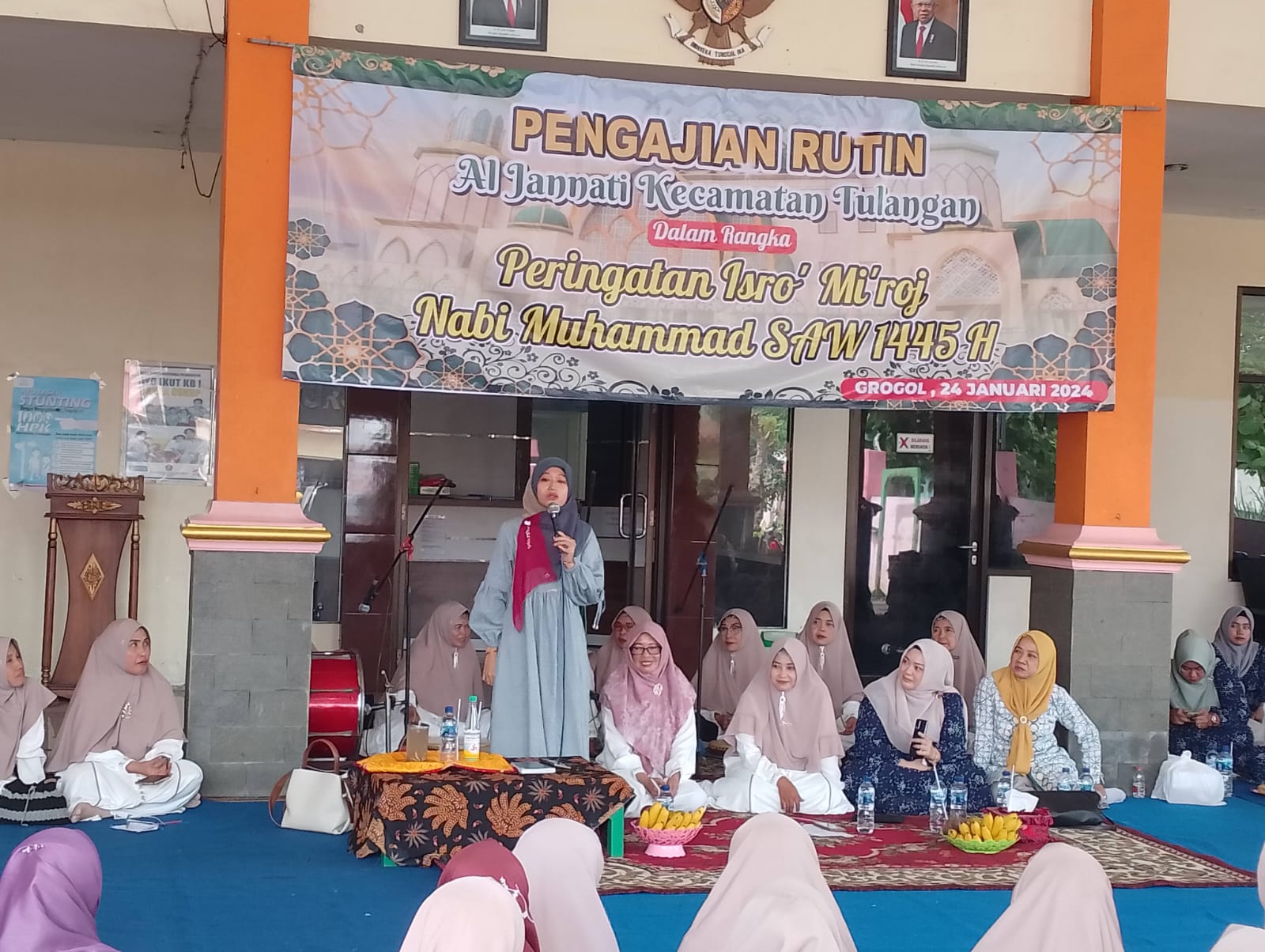 Titik Fidayati kepala desa Grogol menyampaikan sambutan penuh kebahagiaan dalam acara pengajian Al Jannati di pendopo balai desa. Dalam kata katanya, beliau menekankan pentingnya kebersamaan dalam merayakan peristiwa Isra’ Mi’raj Nabi Muhammad SAW 1445 H.