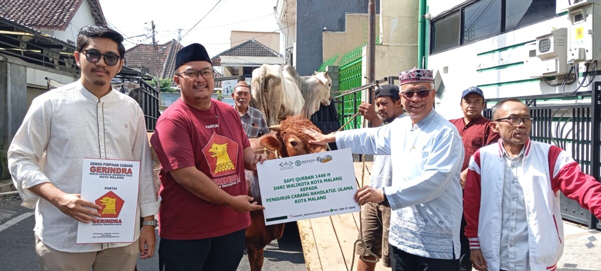 MALANG~www.pilarcakrawala.news|Dalam rangka memperingati Hari Raya Idul Adha, Dewan Pimpinan Cabang (DPC) Partai Gerakan Indonesia Raya (Gerindra) Kota Malang, menyerahkan hewan kurban berupa masing masing 1 (satu ) ekor sapi kepada Pengurus Besar Nahdlatul Ulama (PBNU) dan Muhammadiyah langsung ke kantor cabang masing masing pada Sabtu (07/06/2025).