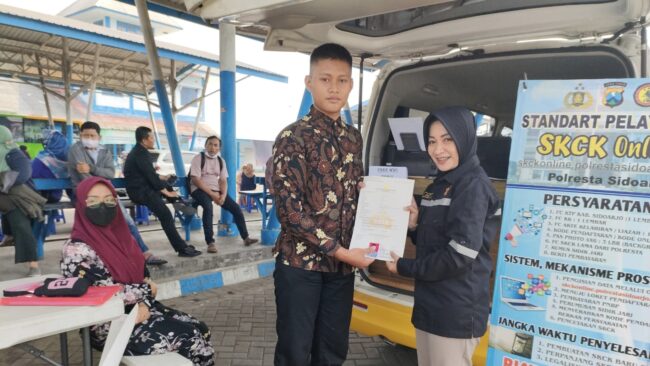 Fasilitas yang dilakukan Polresta Sidoarjo bagi pemohon SKCK, kali ini dengan menghadirkan tiga unit mobil layanan SKCK Keliling Online setiap Selasa dan Kamis mulai pukul 08.00 WIB sampai pukul 11.30 WIB di Pasar Baru Porong, depan Mall Ramayana Krian serta komplek Ruko Tropodo Waru.