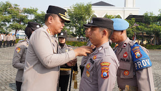 Penyematan Pin ZI WBK dan WBBM kepada anggota tersebut dilakukan Kapolresta Sidoarjo Komisaris Besar Polisi Kusumo Wahyu Bintoro dalam apel pagi di Mapolresta Sidoarjo, Senin (26/6/2023). Nantinya pin ini harus dikenakan saat berdinas sebagai semangat bersama memberikan pelayanan terbaik bagi publik.