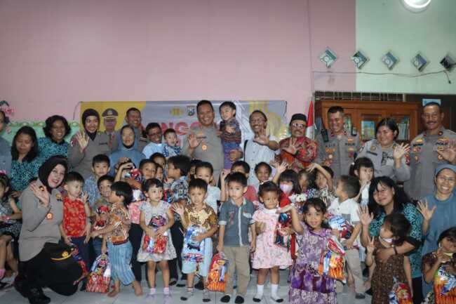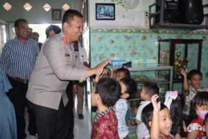 “Apa kabar anak-anak. Tidak takut kan dengan bapak-ibu polisi di sini,” sapa akrab, Kapolresta Sidoarjo Kombes. Pol. Kusumo Wahyu Bintoro.