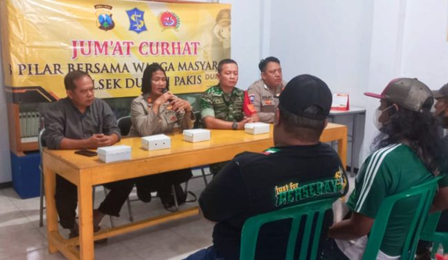 Surabaya~www.pilarcakrawala.news|Polsek Dukuh Pakis melaksanakan kegiatan Jum’at Curhat yang memungkinkan masyarakat menyampaikan secara langsung terkait keluhannya kepada polisi dan dipimpin langsung oleh Wakapolsek Dukuh Pakis Iptu Santa Yulia Sri Surjani,SH bersama 3 pilar.Bertempat di Balai RW.1 Kelurahan Dukuh Pakis Jl.Dukuh Pakis 2 Surabaya.Jum’at (24/2/2023).
