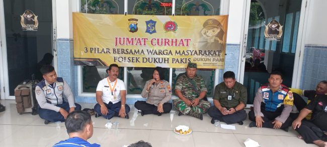 Surabaya~www.pilarcakrawala.news|Polsek Dukuh Pakis kembali menggelar Jum’at Curhat dipimpin oleh Wakapolsek Dukuh Pakis Iptu Santa Yulia Sri Surjani,SH bersama 3 pilar plus.bertempat di Masjid At Taqwa Jl.Dukuh Kupang Barat XVI Surabaya ,Jumat(10/3/2023).