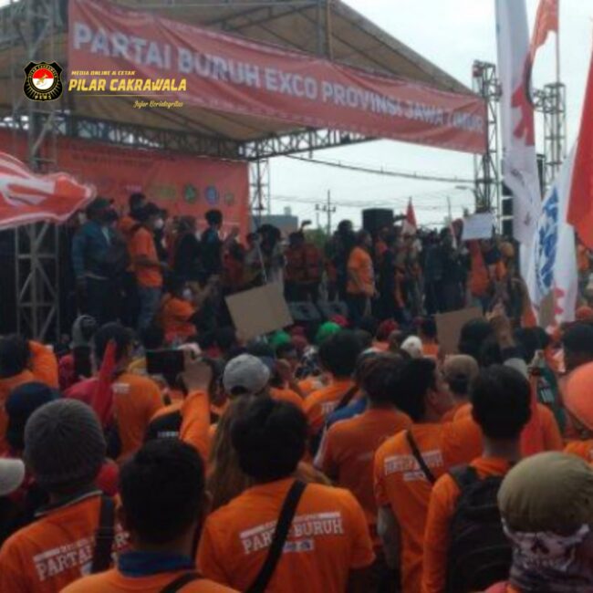 Pilar Cakrawala ~ Surabaya|Sabtu 14/5/2022 Ribuan buruh di Jawa timur turun ke jalan bersama Partai Buruh dan Serikat Pekerja di Jawa Timur merayakan Peringatan May Day dengan menggelar aksi demonstrasi di depan Gedung DPRD Provinsi Jawa Timur.