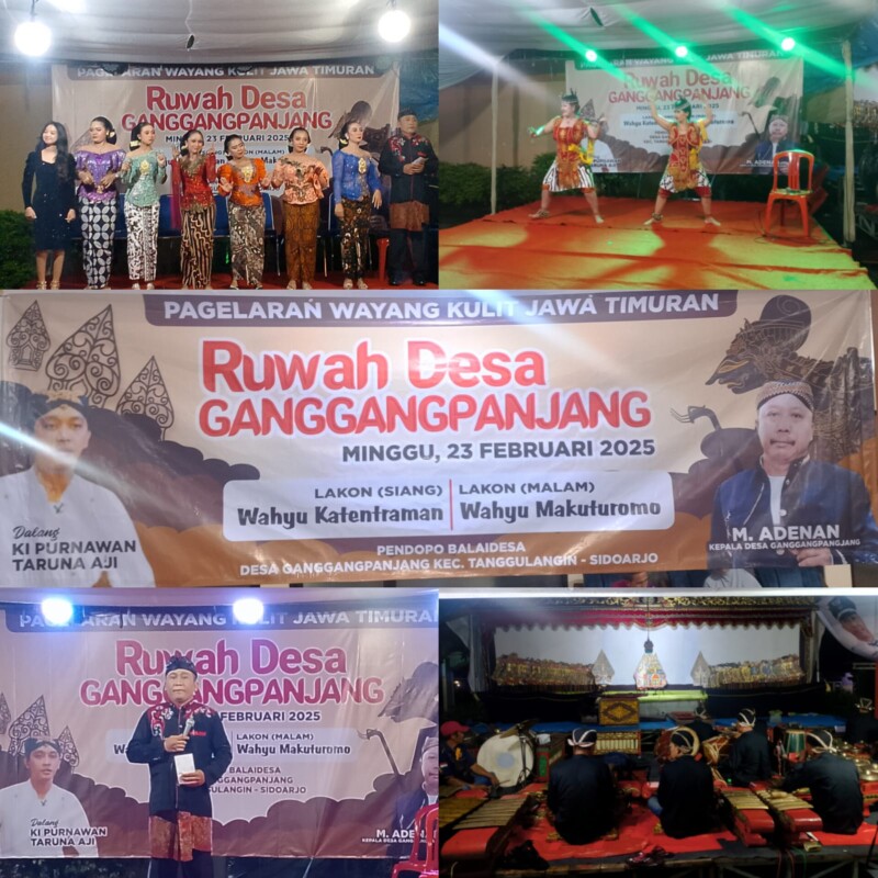SIDOARJO~ www.pilarcakrawala.news|23 Februari 2025 Desa Ganggang Panjang, Kecamatan Tanggulangin, Kabupaten Sidoarjo, kembali menggelar tradisi tahunan Ruwah Desa sebagai bentuk doa bersama demi keselamatan, kesejahteraan, dan keberkahan masyarakat. Acara ini digelar dengan penuh semangat dan antusiasme di pendopo Balai Desa Ganggang Panjang, dihadiri oleh berbagai elemen masyarakat serta pemerintah daerah. Sebagai puncak acara, disuguhkan pagelaran seni tradisional wayang kulit dengan dalang ternama, Ki Purnawan Taruna Aji, yang membawakan lakon “Wahyu Makutarama”, sebuah kisah penuh makna yang sarat akan nilai-nilai kepemimpinan dan kebajikan.