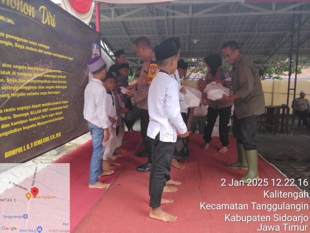 SIDOARJO~www.pilarcakrawala.news|Dengan santunan pada puluhan anak yatim dalam kegiatan pisah kenal atas permohonan diri berakhirnya tugas KOMPOL I.G.P.ATMAGIRI,S.H.,M.H. di kapolsek tanggulangin dengan perpindahan tugas dipolsek Krian di hadiri beberapa jajaran polsek Tanggulan dan Forpincam Tanggulangin Kamis.02 Januari 2025.
