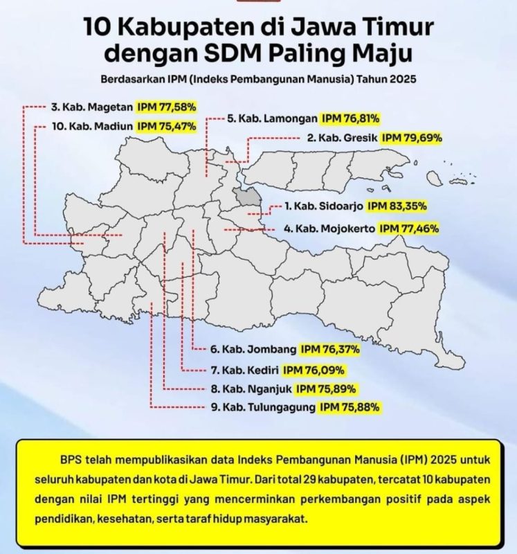 Sidoarjo//www.pilarcakrawala.news| Kabupaten Sidoarjo menorehkan catatan emas dalam peta pembangunan regional tahun 2025. Dengan raihan Indeks Pembangunan Manusia (IPM) sebesar 83,35, Sidoarjo resmi mengukuhkan diri sebagai kabupaten dengan kualitas sumber daya manusia terbaik di Jawa Timur.