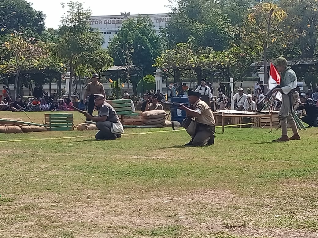 Surabaya~www.pilarcakrawala.news|Aksi heroik pertempuran 10 November 1945 kembali diperagakan oleh komunitas Soerabaia combine reenactor (SCR) yang di dukung oleh komunitas Begandring Surabaya,Mojokerto reenactor, Sedulur onthel Selawase(SOS),Bangil reenactor teatrikal ini di helat di lapangan museum tugu pahlawan Surabaya,Minggu (15/10/2023).
