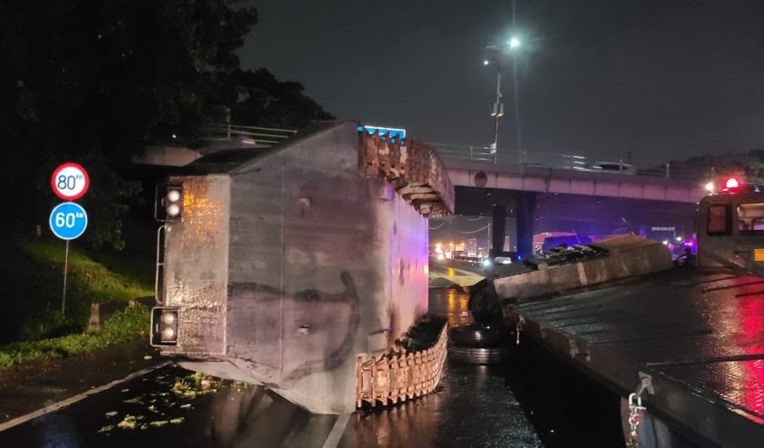 Pilar Cakrawala ~ Surabaya, Jumat 28/1/2022 Sebuah truk TNI pelat 9234 05 memuat tank yang terguling di Tol Perak arah Waru KM 09+200, menyebabkan kepadatan lalu lintas yang cukup panjang.