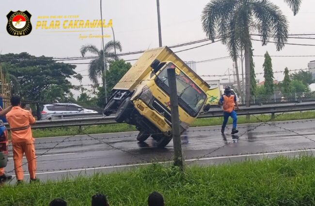 Pilar Cakrawala ~ Sidoarjo, Rabu 9/2/2022 Truk box terguling di ruas jalan Tol Surabaya-Juanda saat menerjang hujan, sekitar pukul 17.00 WIB.