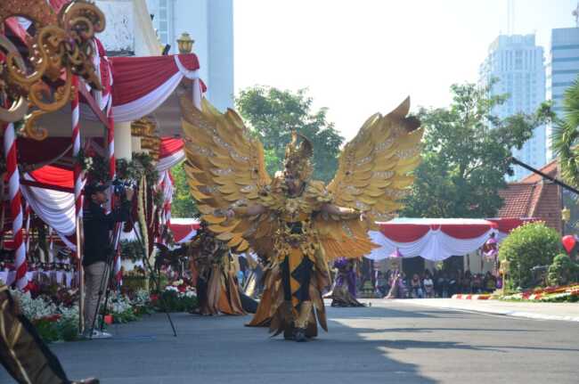 Penampilan kesenian dari Jember Fashion Festival (JFC). Para model yang melakukan fashion show di halaman Grahadi, memamerkan ornamen Burung Garuda sebagai simbol Indonesia.