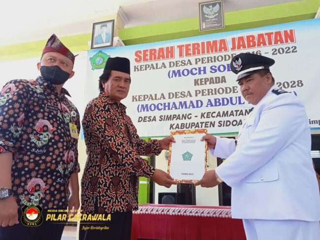 Pilar Cakrawala ~ Sidoarjo |Serah Terima Jabatan (Sertijab) Kepala Desa Simpang kecamatan prambon , Sidoarjo dari kepala desa lama Moch Soleh ke Kepala Desa baru, Mochamad Abdul Kamim, Kamis (28/7/2022). Mochamad Abdul Kamim terpilih pada perhelatan Pilkades serentak Kabupaten Sidoarjo tahun 2022 dan dilantik Bupati Sidoarjo, Selasa (26/7/2022).