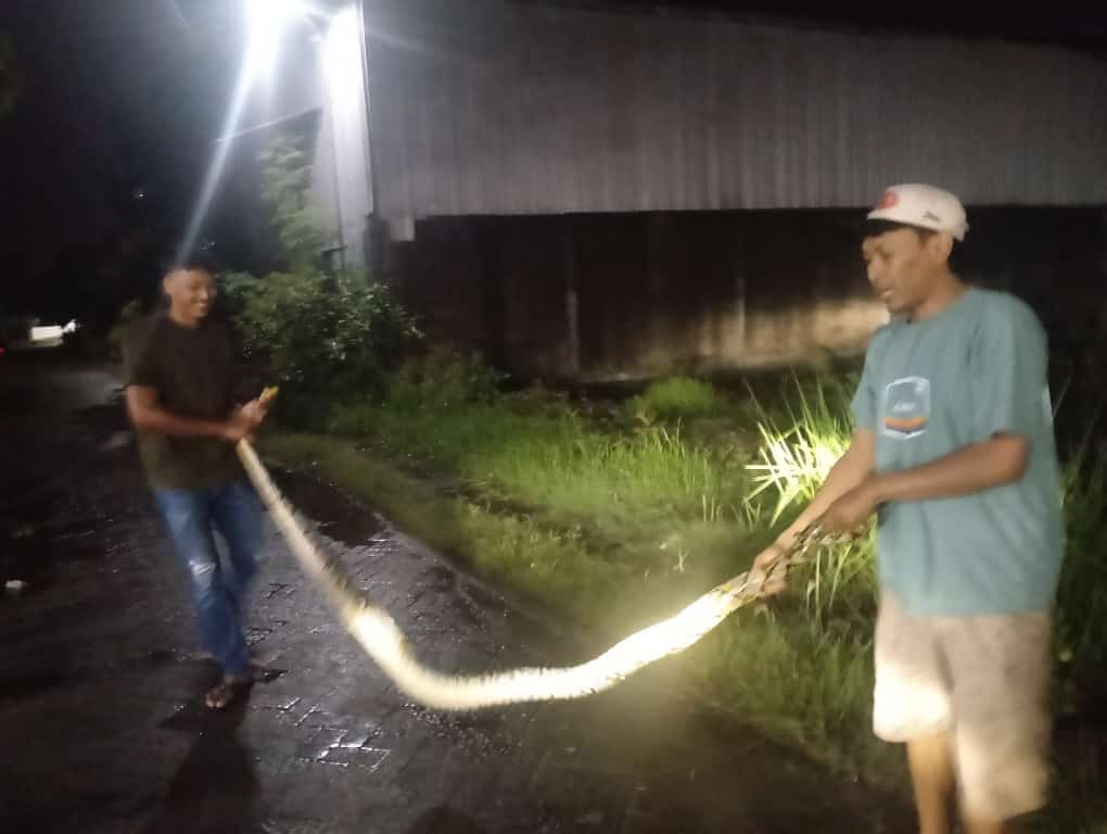 Lanjutnya, ”Dengan terlihatnya ular besar bergegas saya memanggil warga di warkop untuk berbondong-bondong menangkapnya, Jerih paya warga menuai hasil satu ekor ular dengan panjang kurang lebih tiga meter berjenis sanca kembang tertangkap”.