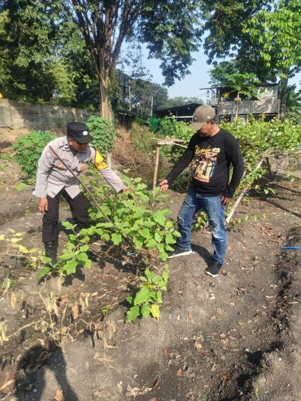 SIDOARJO~www.pilarcakrawala.news|Guna mendukung program ketahanan pangan Polresta Sidoarjo Polda Jawa Timur dan arahan Kapolresta Sidoarjo Kombes Pol Christian Tobing, Bhabinkamtibmas Ketegan Polsek Taman, Aipda Ugi P, melaksanakan kegiatan pengecekan langsung terhadap lahan penanaman terong milik warga di Desa Ketegan, Kecamatan Taman, Kabupaten Sidoarjo, pada Minggu (8/6/2025).